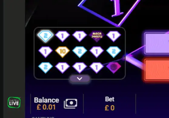 A unique feature of the game is the randomly triggered Mega Party, which boosts all the payouts on the wheel. There is a 12% chance of the Mega Party being triggered every game round. In my experience, it's more like every 15 spins, although the math says it's 7-8.