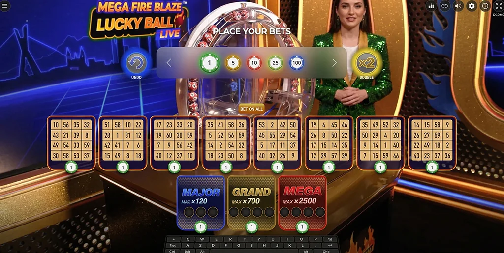 This live dealer bingo game is played with a maximum of eight 4x4 cards. Lucky Ball numbers boost line payouts up to 99:1, while three Bonus cards, if filled, gain you entry into the Mega Fire Blaze Bonus round, where the maximum win is 2,500:1.