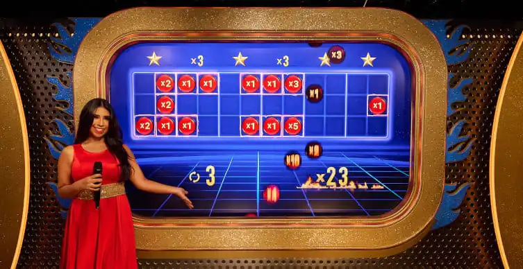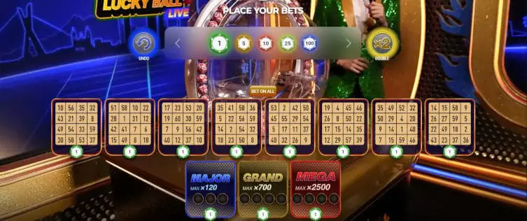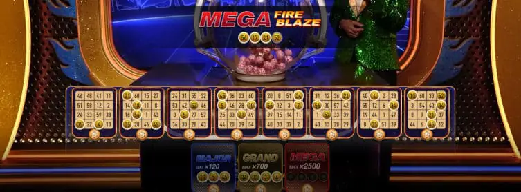 This live dealer bingo game is played with a maximum of eight 4x4 cards. Lucky Ball numbers boost line payouts up to 99:1, while three Bonus cards, if filled, gain you entry into the Mega Fire Blaze Bonus round, where the maximum win is 2,500:1.