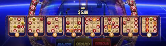 Payouts on the bingo cards go from 4:1 up to 99:1, while the bonus round Major pays 4 – 199:1, Grand 9-699:1 and Mega 19 – 2499:1.