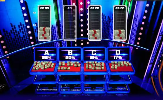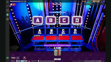 The Money Drop game round makes use of 4 platforms A-D. Depending on your risk appetite, you can distribute your cash across up to 4 of the platforms. A Random Number Generator decides whether to drop the cash on up to three of the platforms. The money remaining on the last platform is either won or goes forward to the next drop round where the process is repeated. If you've chosen a platform that remains you have won that sum of money.