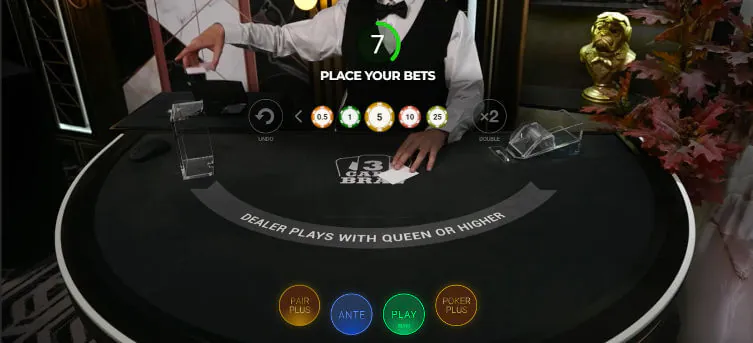 In Live 3 Card Brag, the aim is to beat the dealer's three cards with a better value 3-card poker hand.
