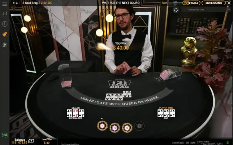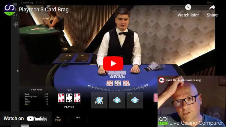 Playtech Live 3 Card Brag is very similar to Evolution Gamings Live 3 Card Poker.