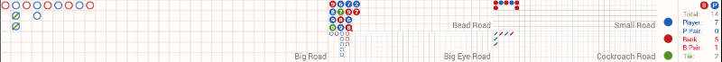 Playtech provides 5 Road Maps for each table. These show the trends of the shoe, all based on the past hands. Each road map displays information from the shoe in a different manner, so there's probably a road map that displays the stats in the way you like them. You can pick from the Big Road, Bead Road, Big Eye Road, Small Road and Cockroach Road. A full explanation of how the different roads are constructed can be found here. If you're interested in finding out how to use the road maps check out my Baccarat Betting Strategy where I explain what I do.