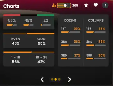 - Percentage breakdown of Red/Black/Zero, Odd and Even, High and Low, Each of the Dozens and Columns.
