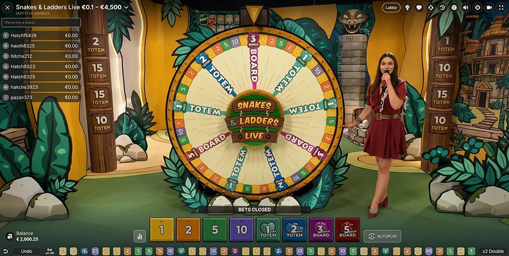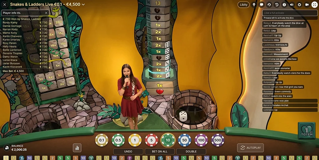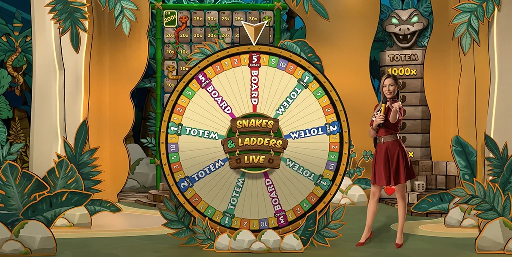 Snakes & Ladders Live is a live dealer entertainment game show where you can gamble on the outcome of dice rolled. The game has two bonus rounds, a Snakes & Ladders Board and a Snake Totum, where you can win Multipliers payouts on your bets. The maximum win is 20,570x, so this game has plenty of potential.