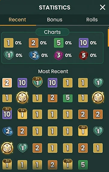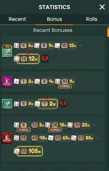 The Bonus Round statistics give information about each round, including the number of rolls, the ending tile and the final multiplier payout.