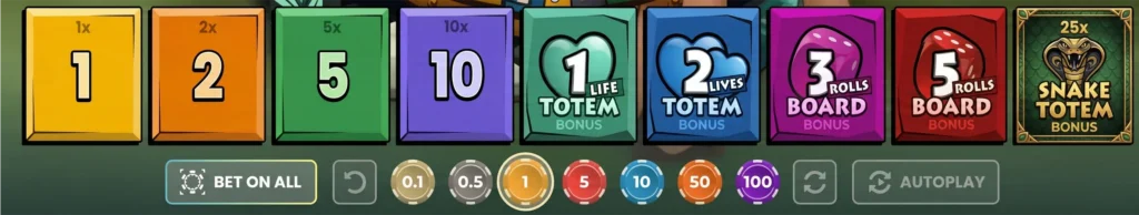 There are eight betting options: Numbers One, Two, five, and ten and four for the bonus rounds 1 Life Totem, 2 Lives Totum, 3 Rolls Board, and 5 Rolls Board 2.