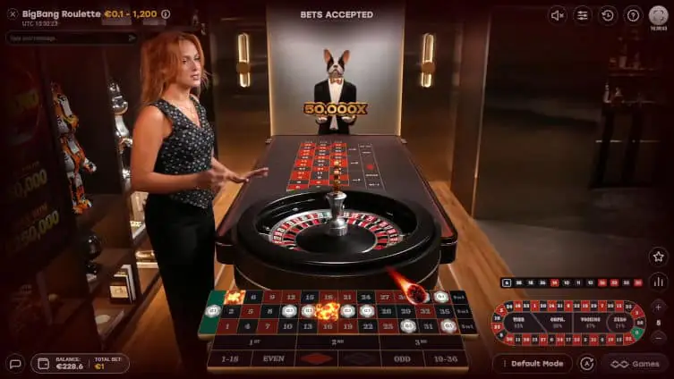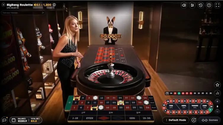 Big Bang Roulette is a highly volatile live dealer game. The top multiplier is 50,000x, with payouts capped at €£$250,000.
