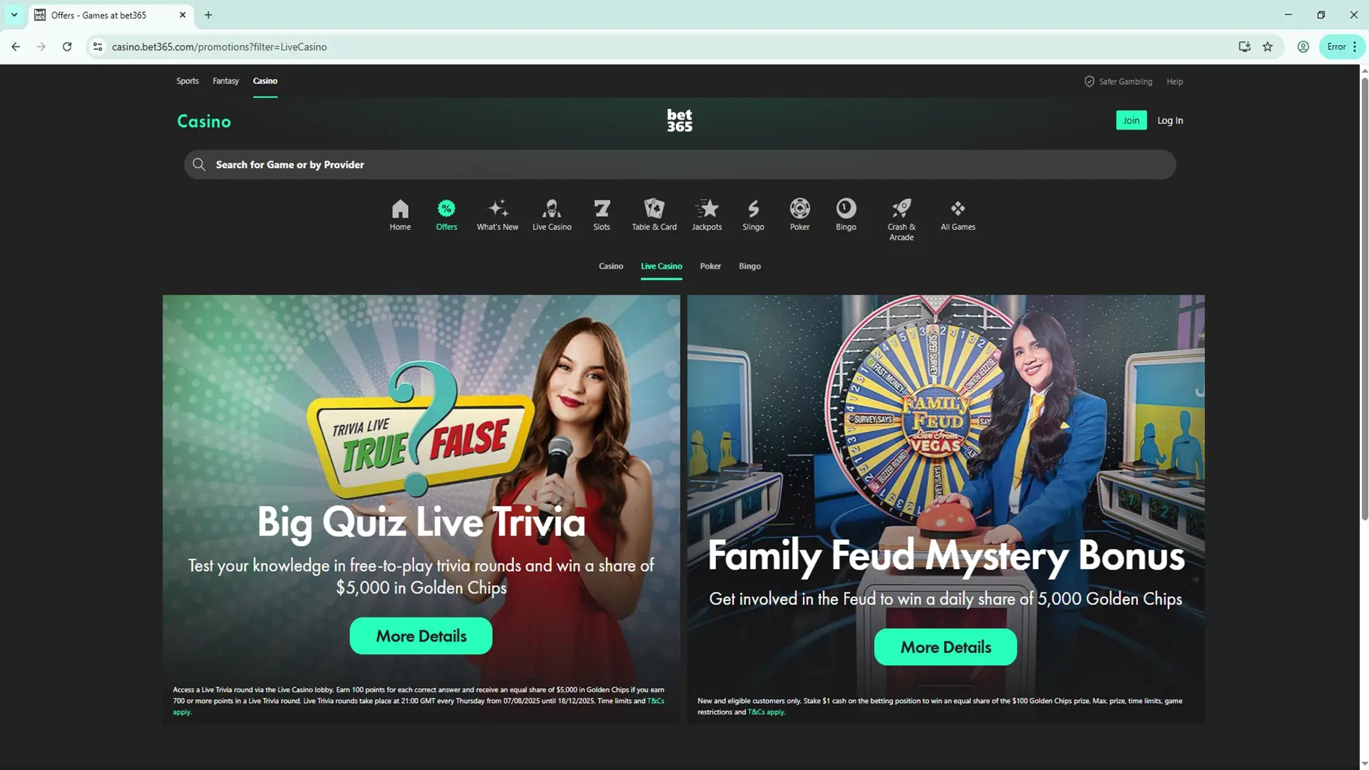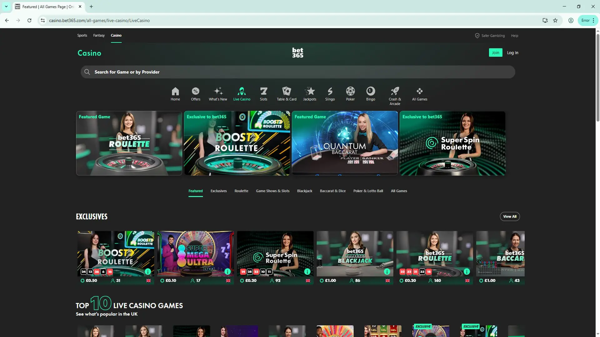 Yes. There is a separate section of Bet365 that handles live games. It’s called Live Casino and is between the Casino and Games sections.