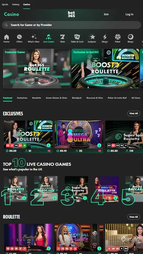 There is a full range of live casino table games at Bet365, with an extensive suite of dedicated Live Blackjack and Live Roulette tables explicitly reserved for Bet365 players.