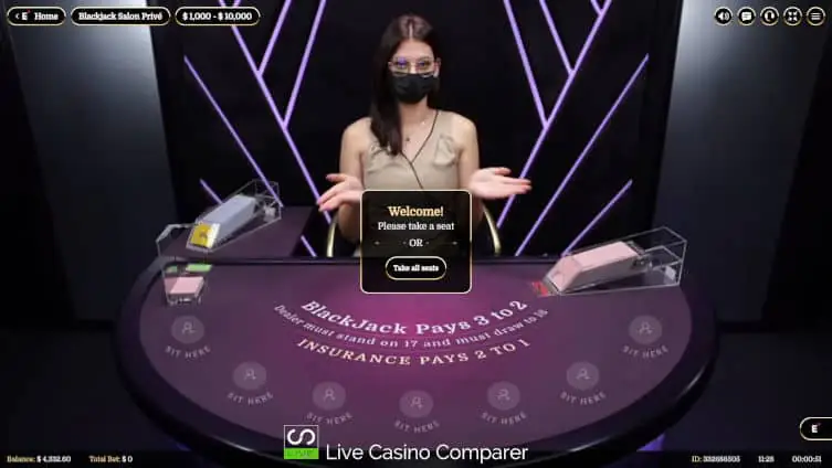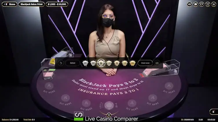 Ezugi has created a Salon Prive Blackjack table, especially for high stakes players. You’ll need a minimum balance of $€1,000 to take one or all seats on this very opulent table.