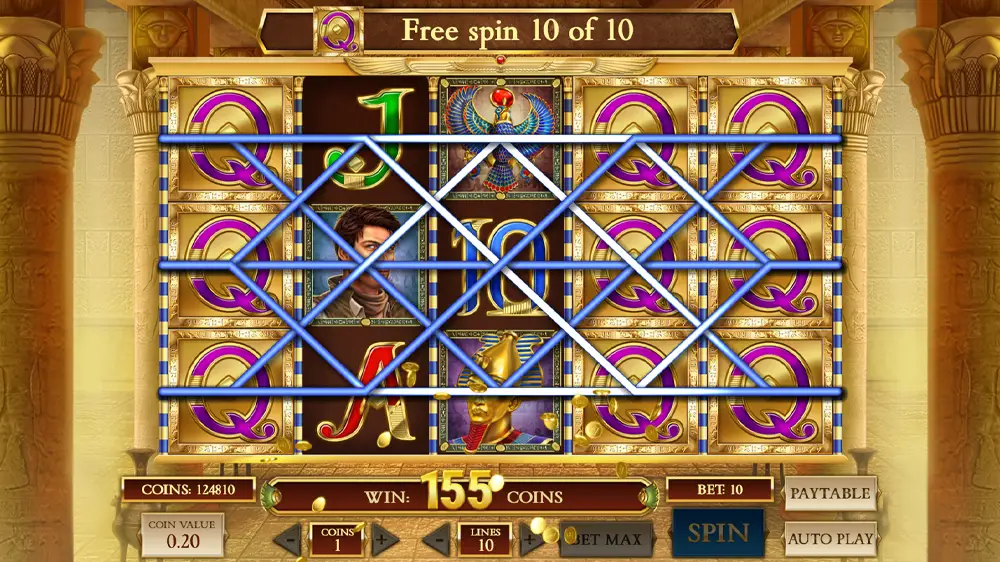 You’re looking at the slot machine Book of Dead with a 5×3 grid and adjustable paylines from 1 to 10. Wins count left to right on selected lines. Symbols are all theme-led: Rich Wilde at the top, then pharaoh, Anubis, and Horus’s falcon, followed by royal ranks A to 10. There’s one special symbol that matters more than everything else: the book.