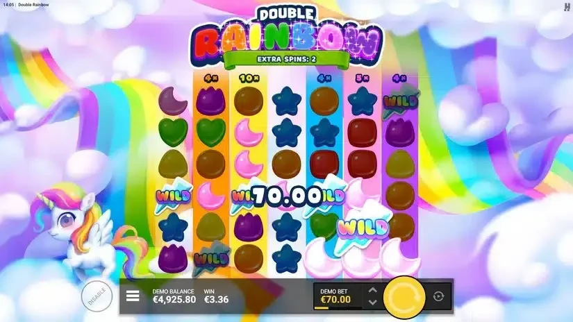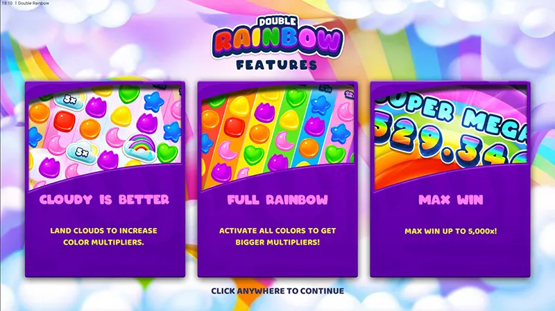 - Double Rainbow Clouds that super-charge the board. The rarer Double Rainbow Cloud adds its multiplier to every active reel, not just one column, and throws in three extra spins with all those boosted reels locked in. This is where the balance can jump sharply.