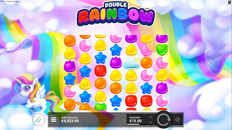 Under the pastel visuals slot machine Double Rainbow is a 7×6 cluster title with cascading wins and colour-based reel multipliers. Wins land when five or more matching sweets connect horizontally or vertically, then vanish to make room for new symbols. There’s no separate bonus round; instead, cloud symbols unlock extra paid spins and build up those reel multipliers directly on the main grid. In practice it feels more like charging up an engine for bursts of potential than spinning towards a single, scripted feature.
