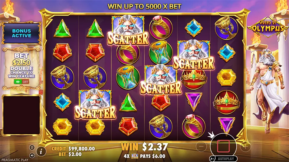 - Zeus scatters: 3–6 scatters pay x3, x5, x100 or x500, and 4 or more launch the bonus round that defines this game type.