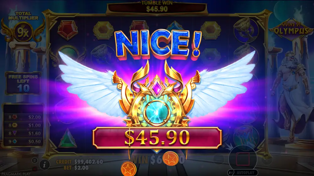 - Special symbols: Zeus scatter; green-gold winged multiplier orb.