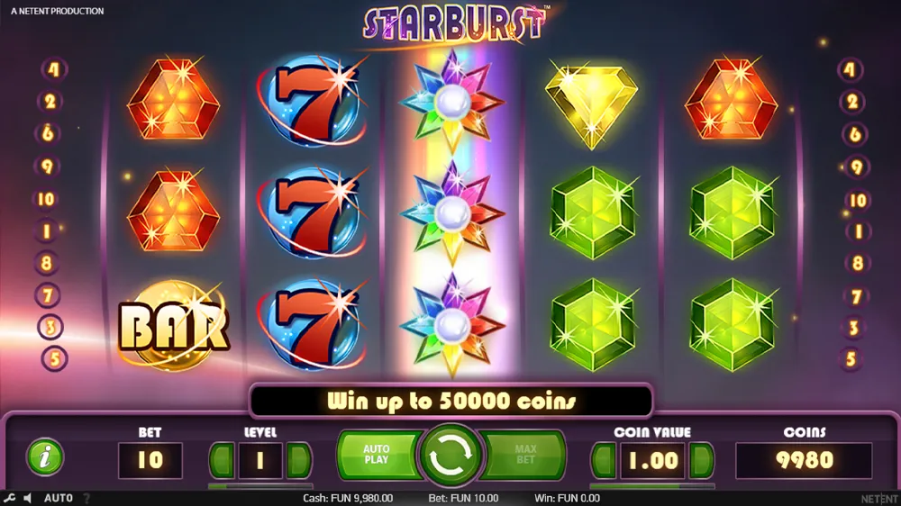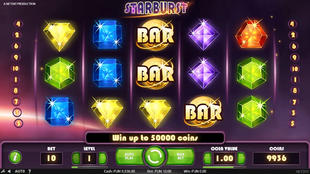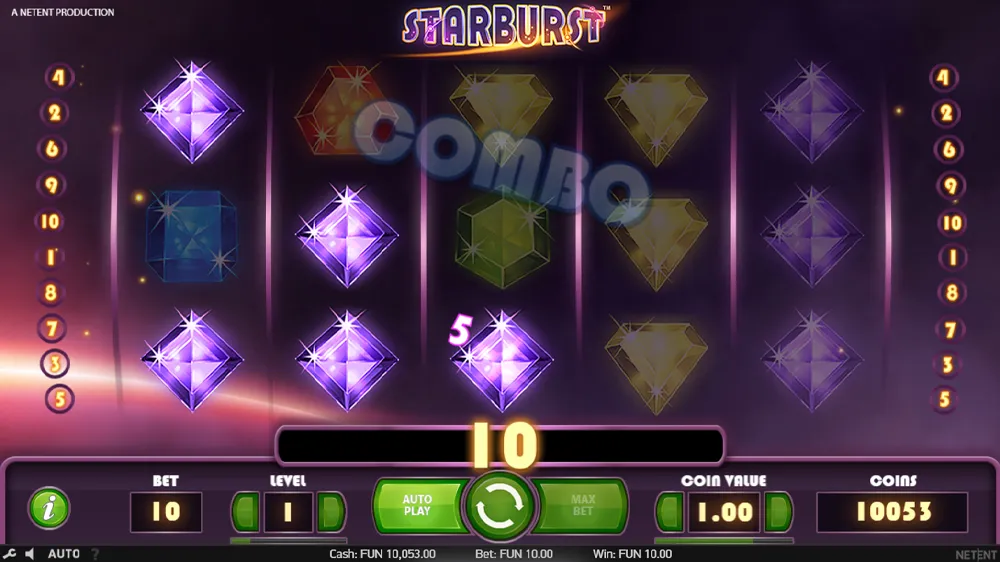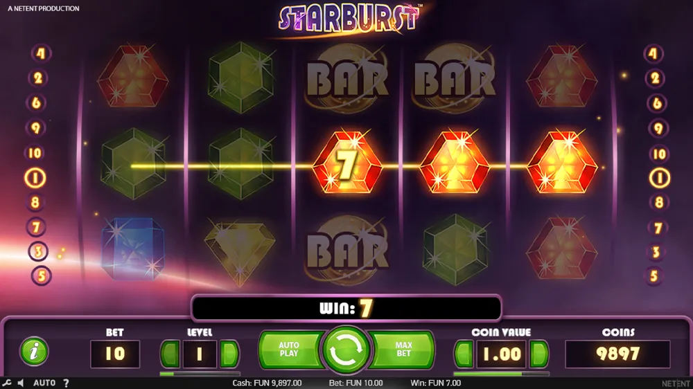 Playing Starburst is simple and fun. Choose your bet level and coin value, then click Spin to start the reels. Wins occur when three or more matching symbols land on one of the 10 paylines — which pay both ways, from left to right and right to left.