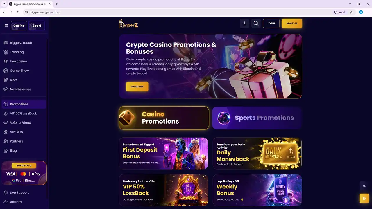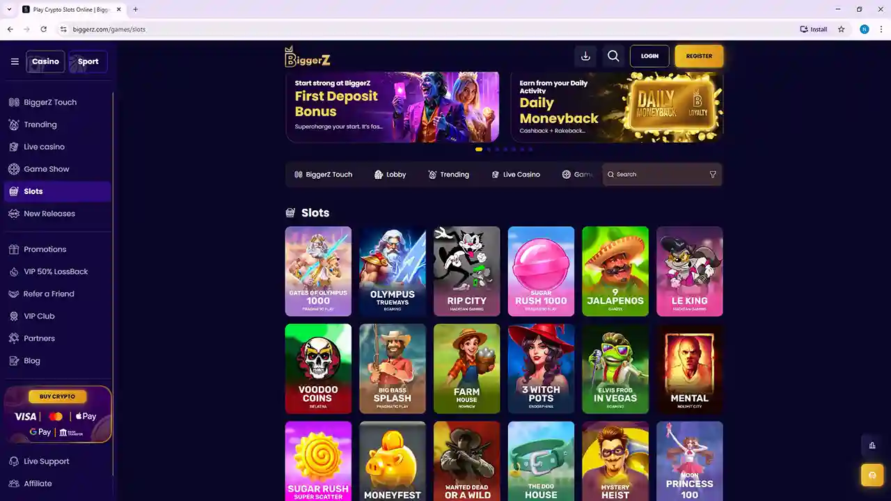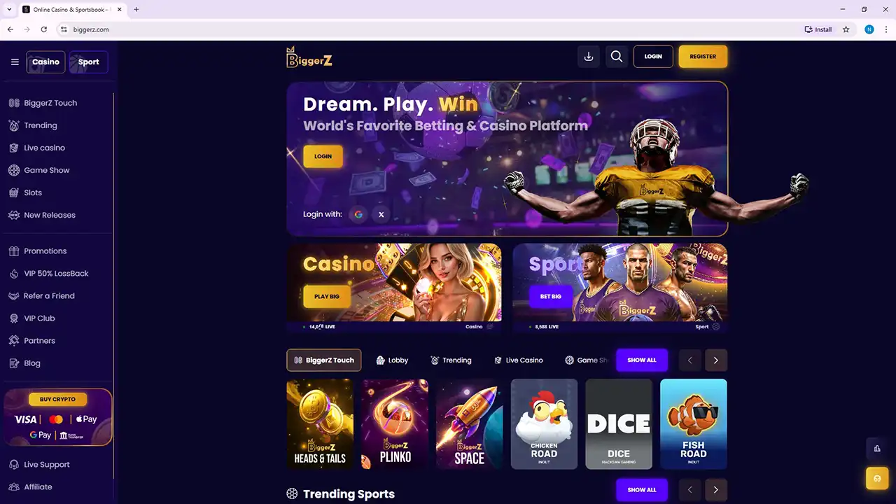 Available in your region!BiggerZ is a crypto-friendly online casino and sportsbook offering thousands of games, live dealer tables, fast payouts, and multi-currency payments under an Anjouan gaming license.