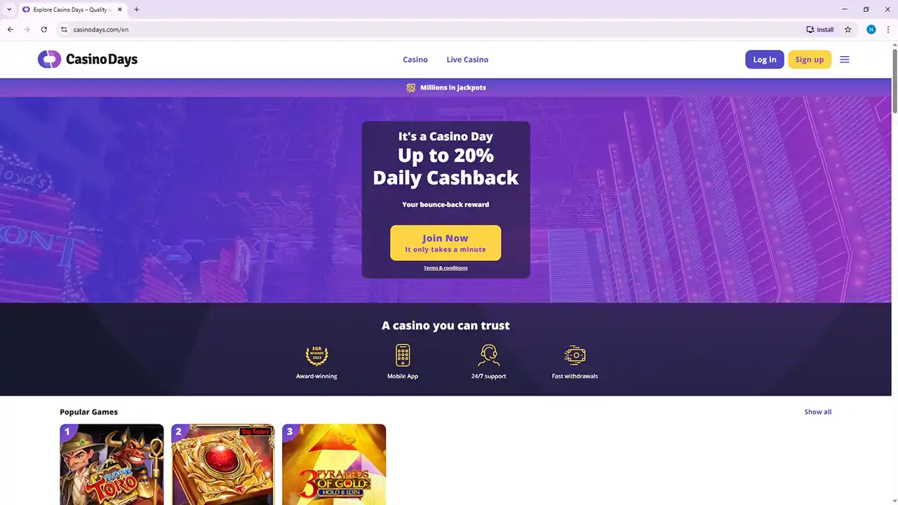 Access to Casino Days is restricted in your current location. Don’t worry — we’ve picked the top trusted alternatives for you to enjoy today, featuring massive bonuses and welcome packages.