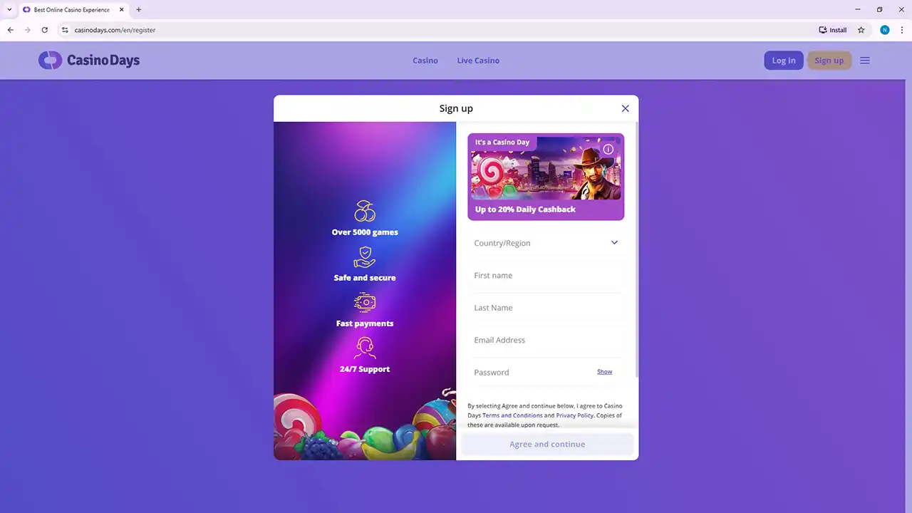 Casino Days Mobile Registration Page
