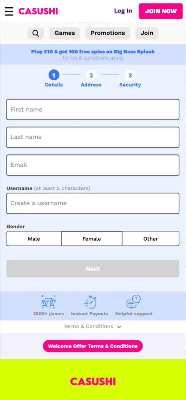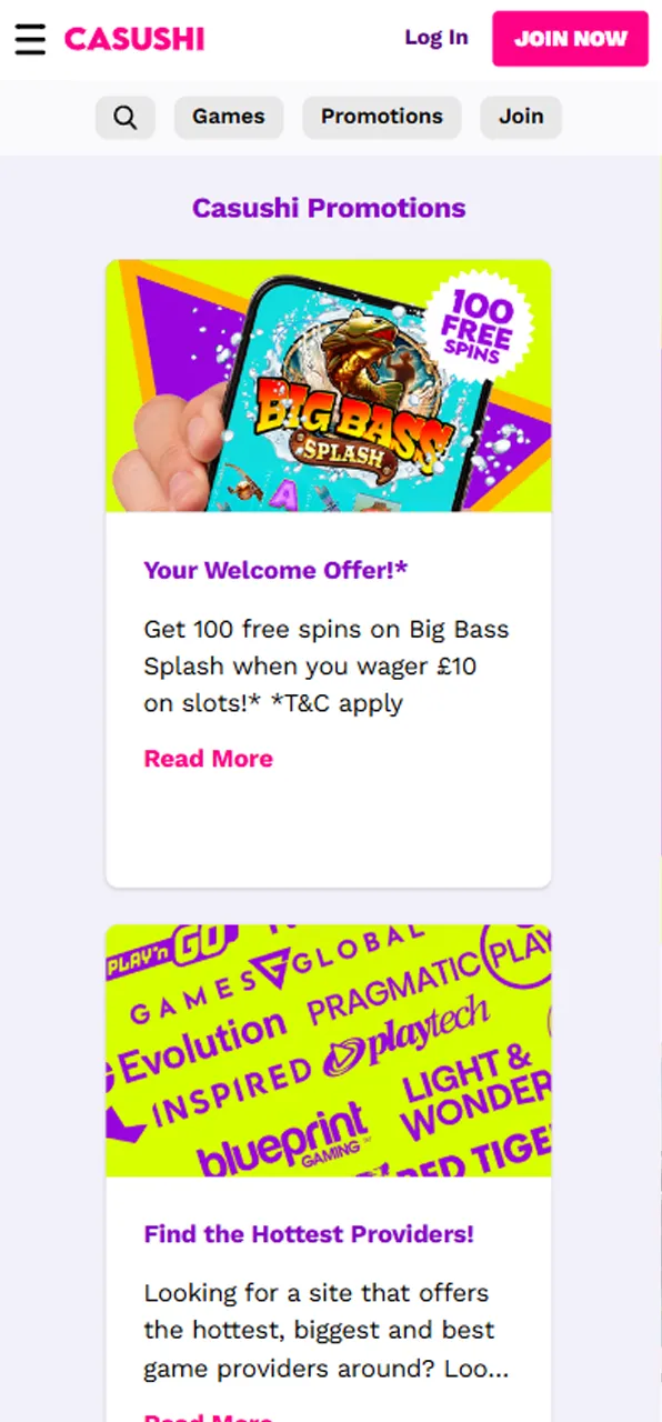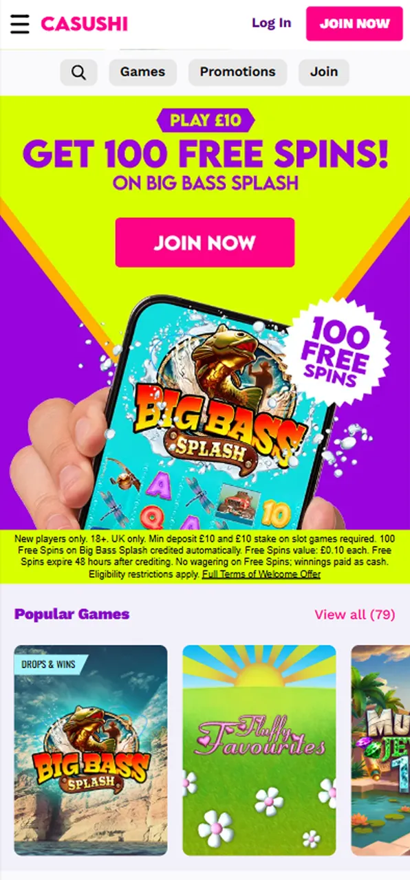New players receive 20 free spins in Big Bass Splash as a Casushi sign up offer.