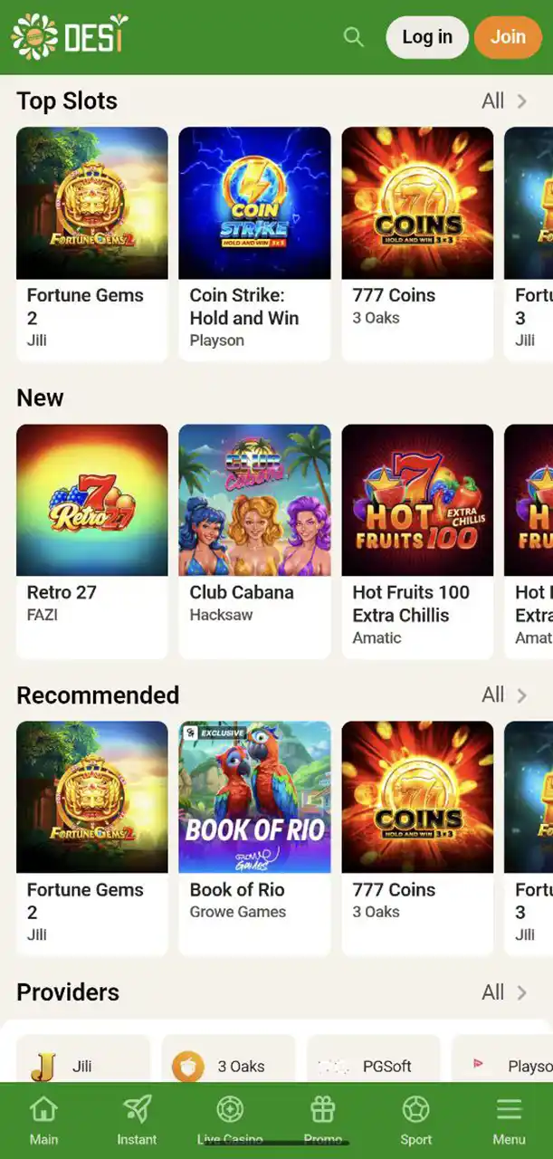 Top providers like Jili, 3 Oaks, Amusnet, Evolution, and Hacksaw are available at Desi Casino.