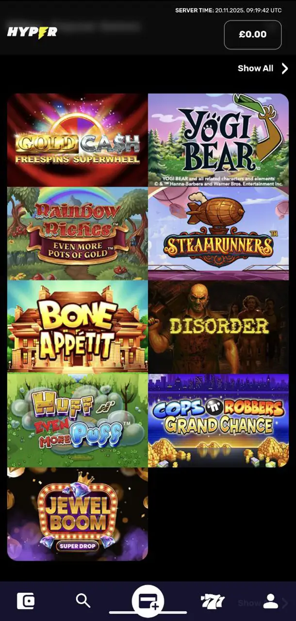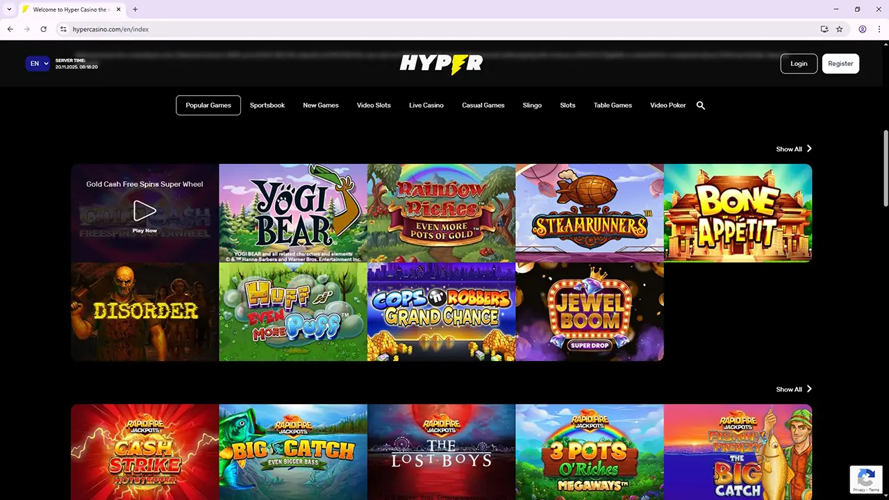 Hyper Casino is a platform that doesn’t aim to be distinctive, offering simple and straightforward functionality for players. Here you’ll find a variety of games across various categories and even a sportsbook, although the main focus is on the casino section.