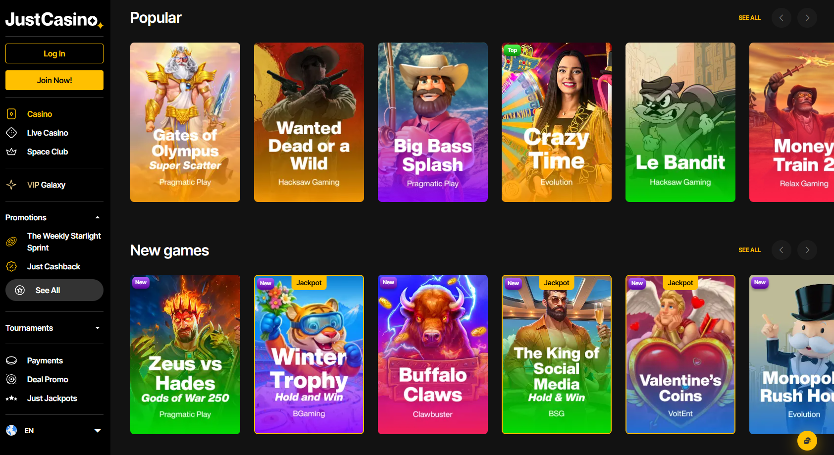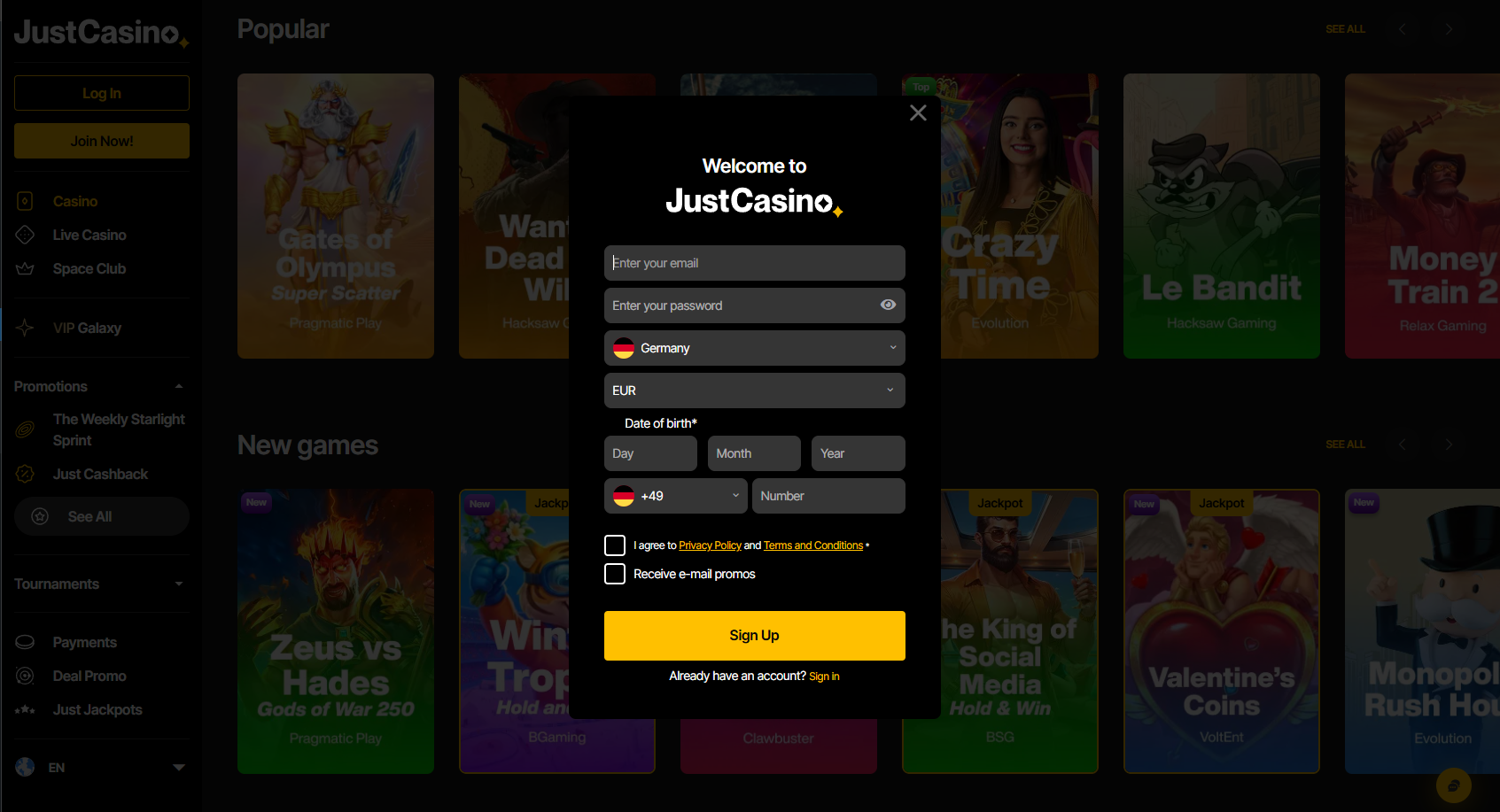 Available in your region!JustCasino is a modern online casino offering a wide range of slots, live dealer games, and crypto-friendly payments, designed for fast gameplay and international players.