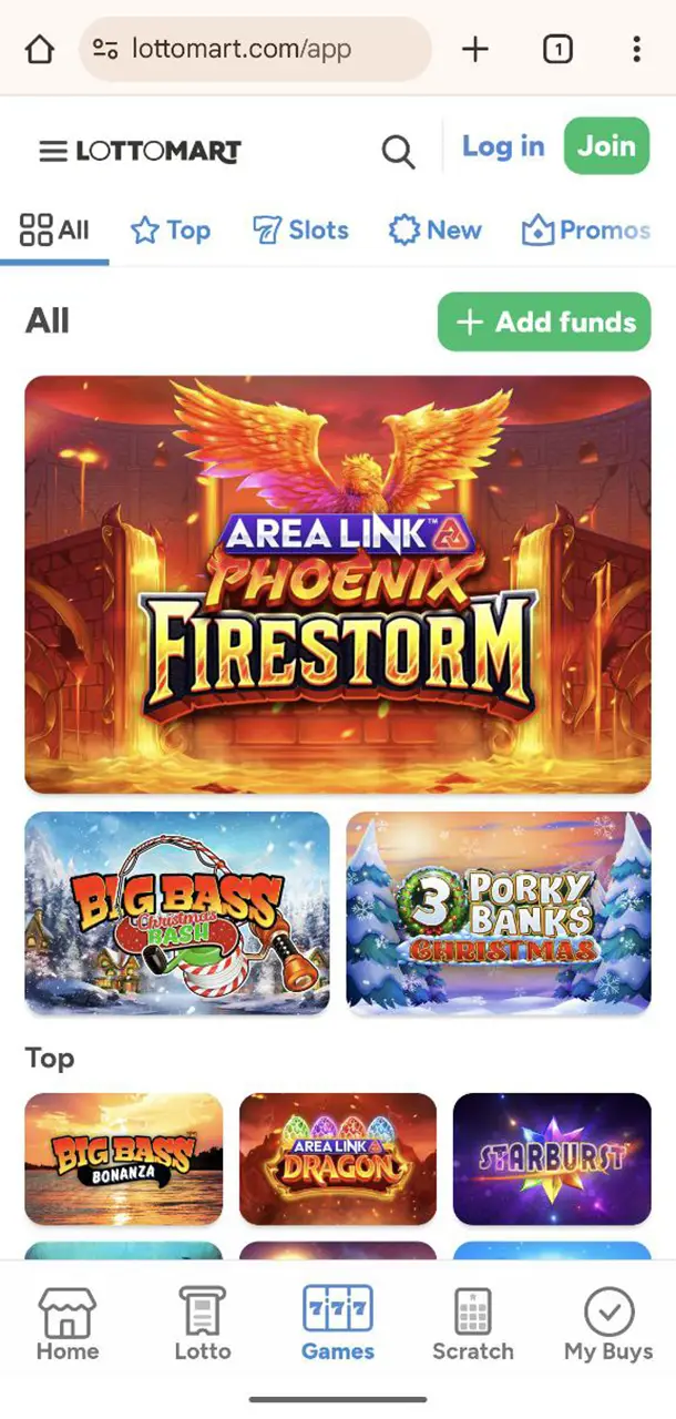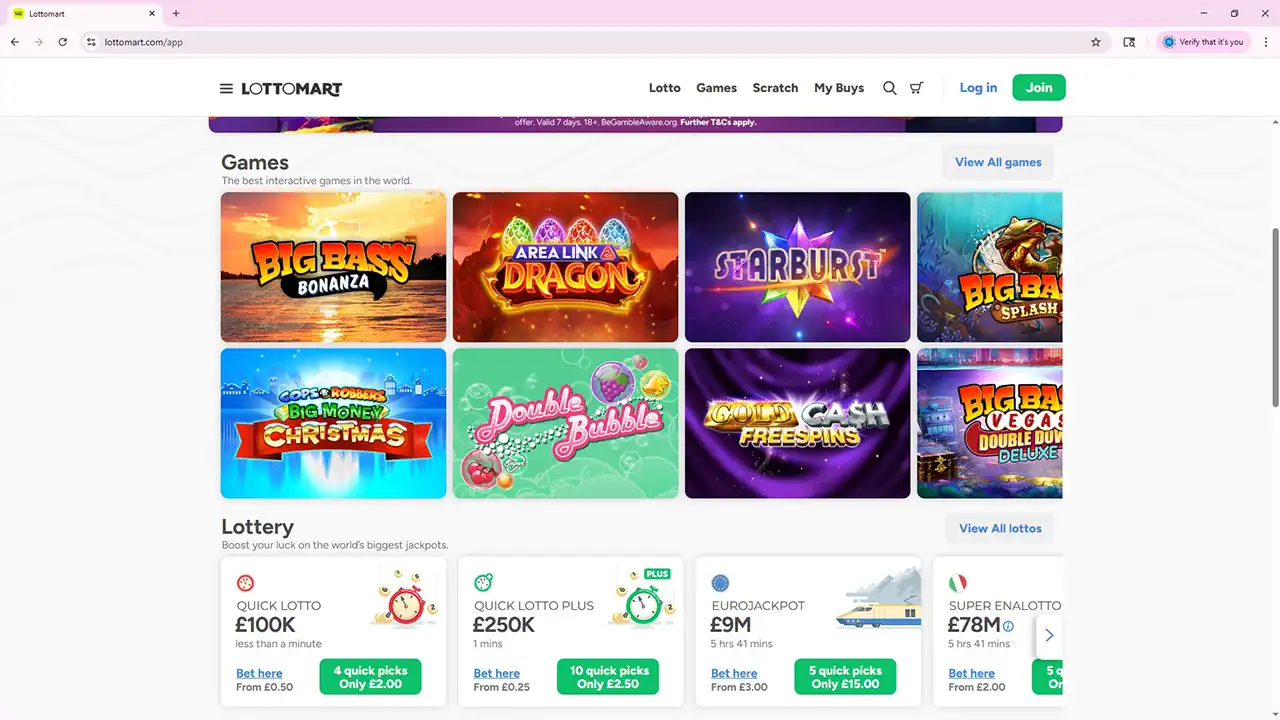This Lottomart review looks at a hybrid gambling platform that combines lotto betting, scratchcards and a full casino lobby in one place. The brand focuses on a streamlined, app-like layout where you can move between draws, instant-win cards, online slots, table games and a sizeable live section without digging through cluttered submenus.