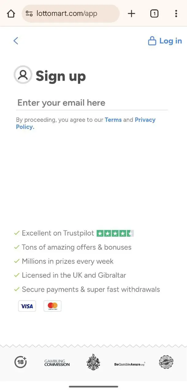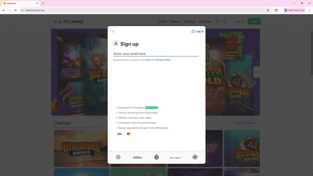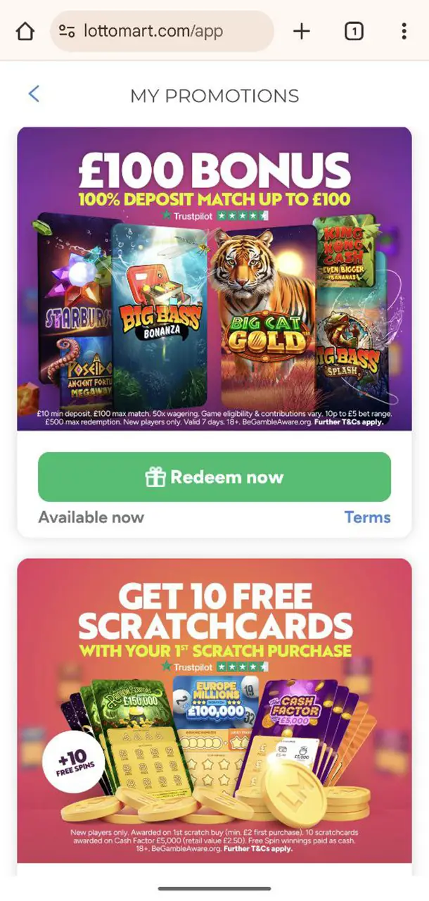 Lottomart online platform uses a step-by-step registration process and then lets you choose between two alternative welcome deals: the 100% Games Welcome Match Deposit Offer or the Scratch Welcome Offer with free scratchcards and spins. Your very first real-money purchase determines which one you receive.