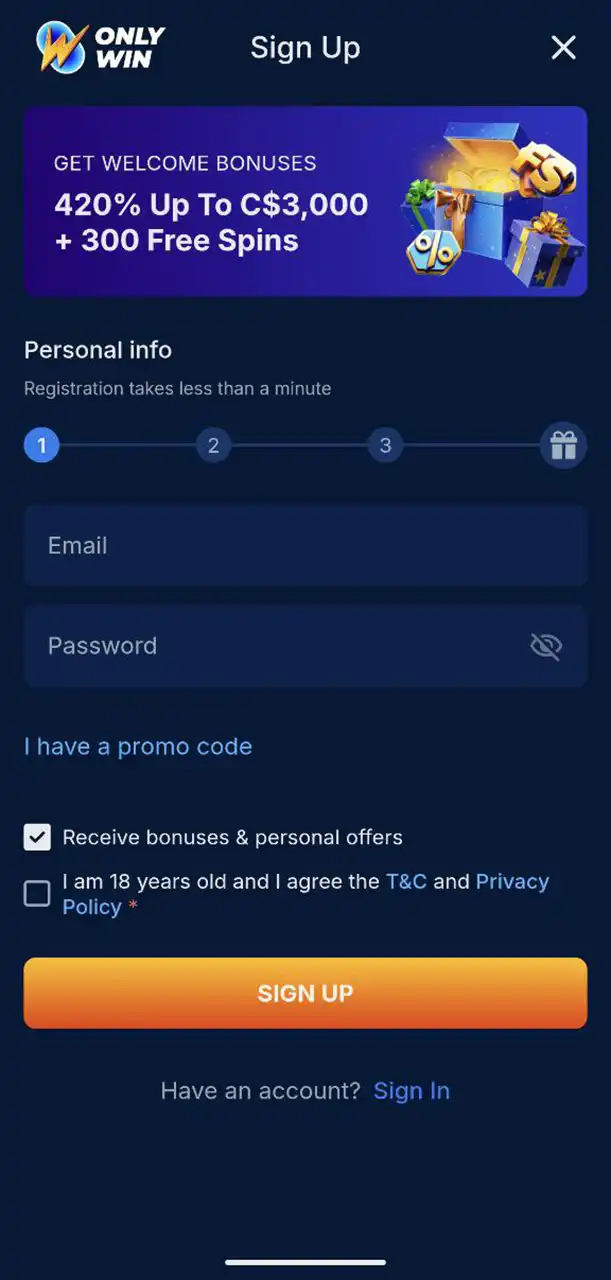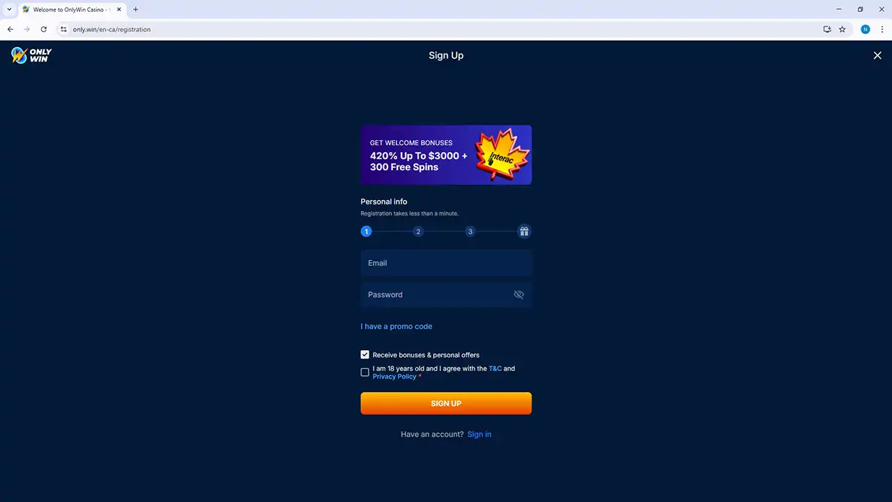 OnlyWin Casino Registration Page