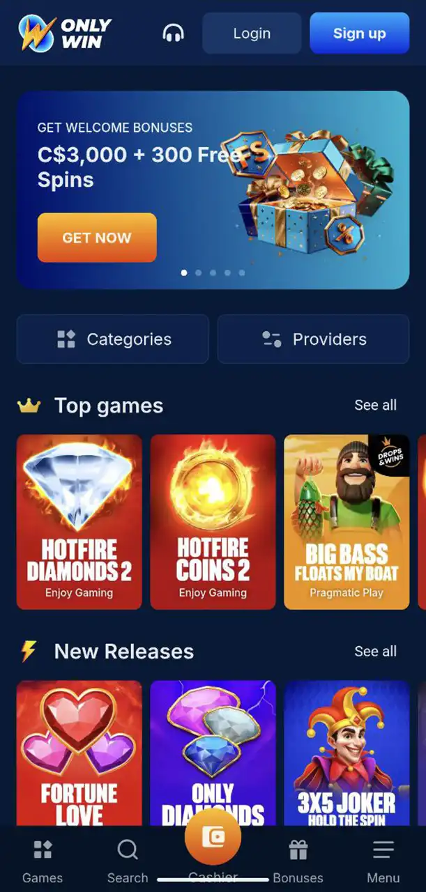 OnlyWin Casino Mobile Home Page