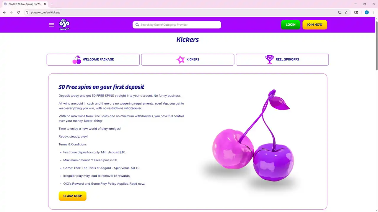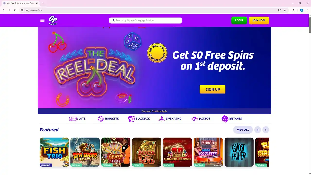 Available in your region!PlayOJO Casino, founded in 2017, operates on the trusted SkillOnNet network and is celebrated for its fair-play philosophy — no wagering requirements, transparent bonuses, and instant rewards. With thousands of slots, live games, and a modern user experience, PlayOJO delivers fun, honesty, and innovation in online gaming.