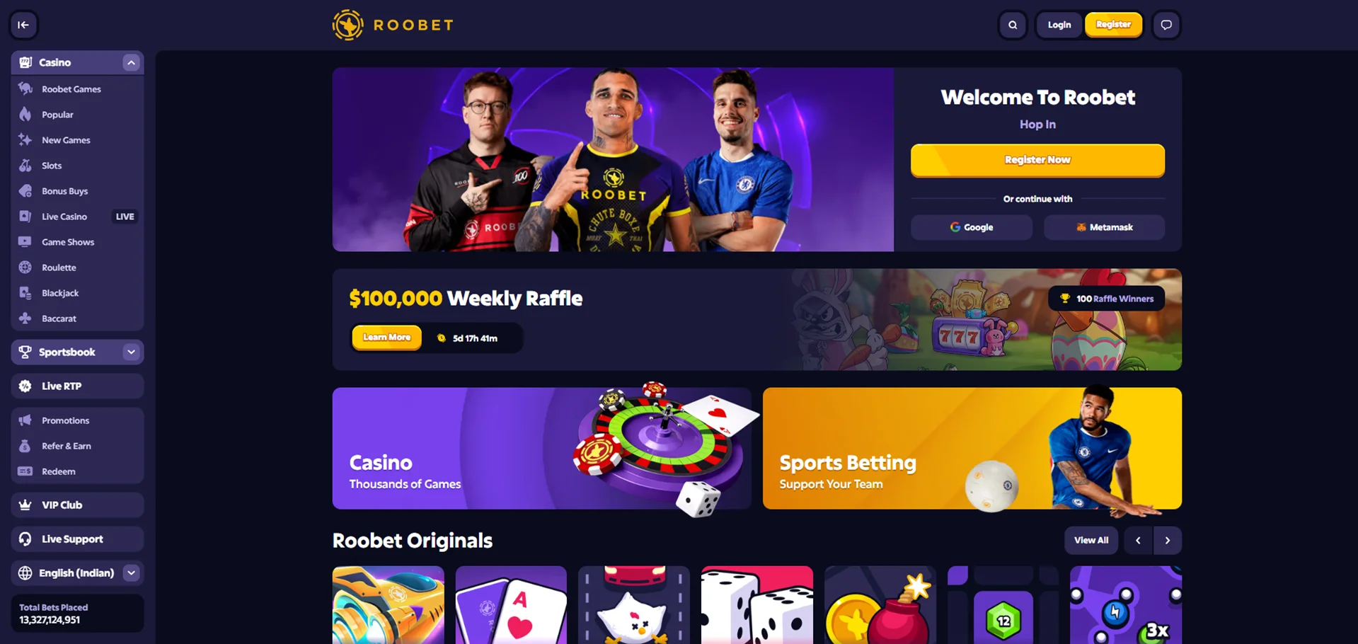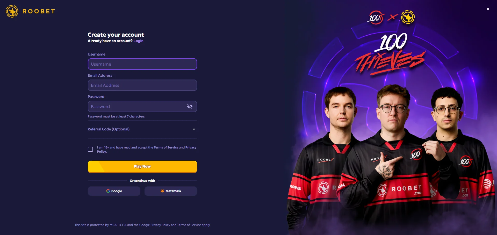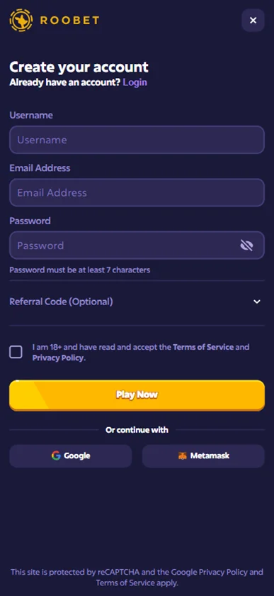 You can also create an account via Google or MetaMask if you already have one. Simply click the button for your preferred service, and your details will be automatically linked to your Roobet account.