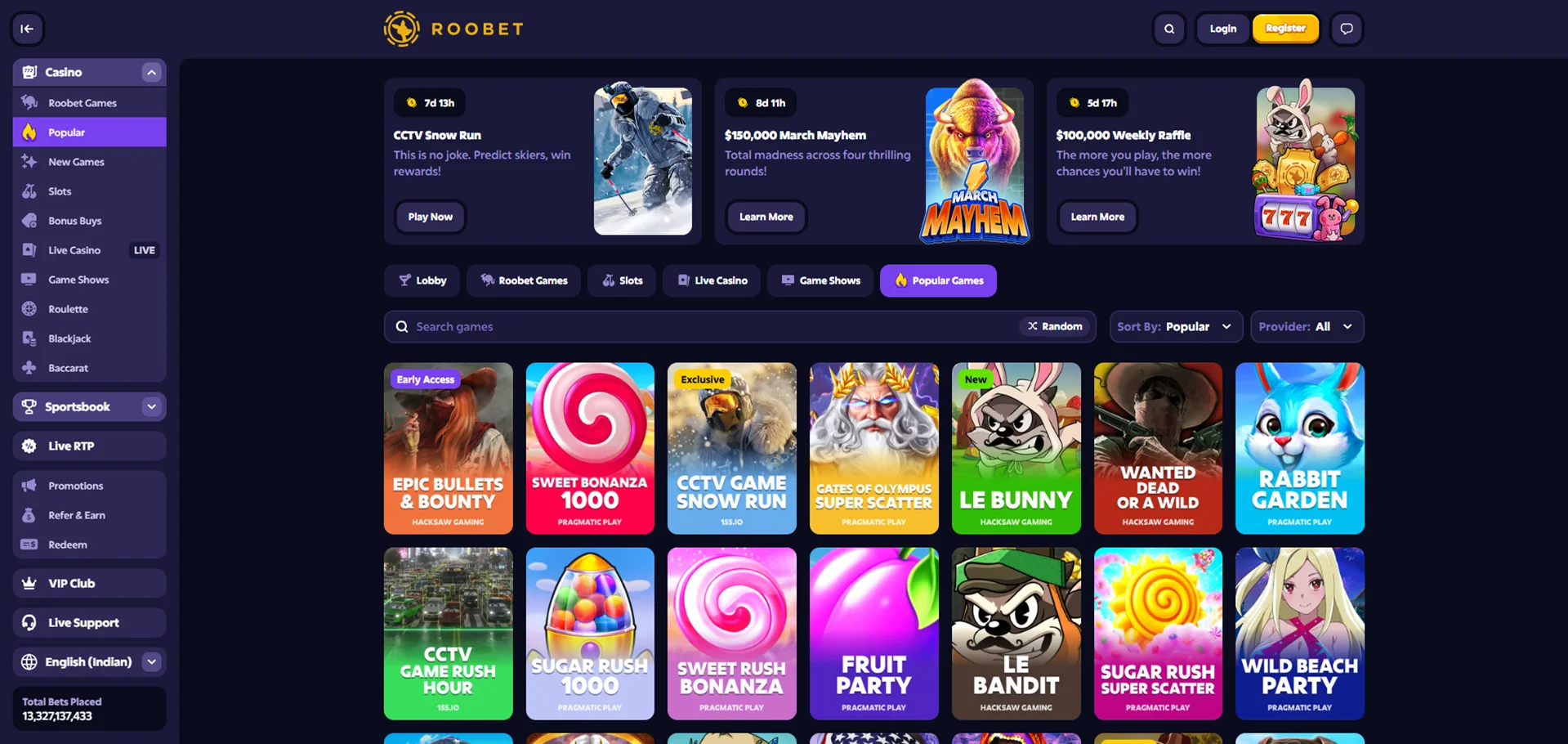United States of America: RestrictedRoobet offers a wide selection of casino games – players can enjoy numerous slots and classic table titles.