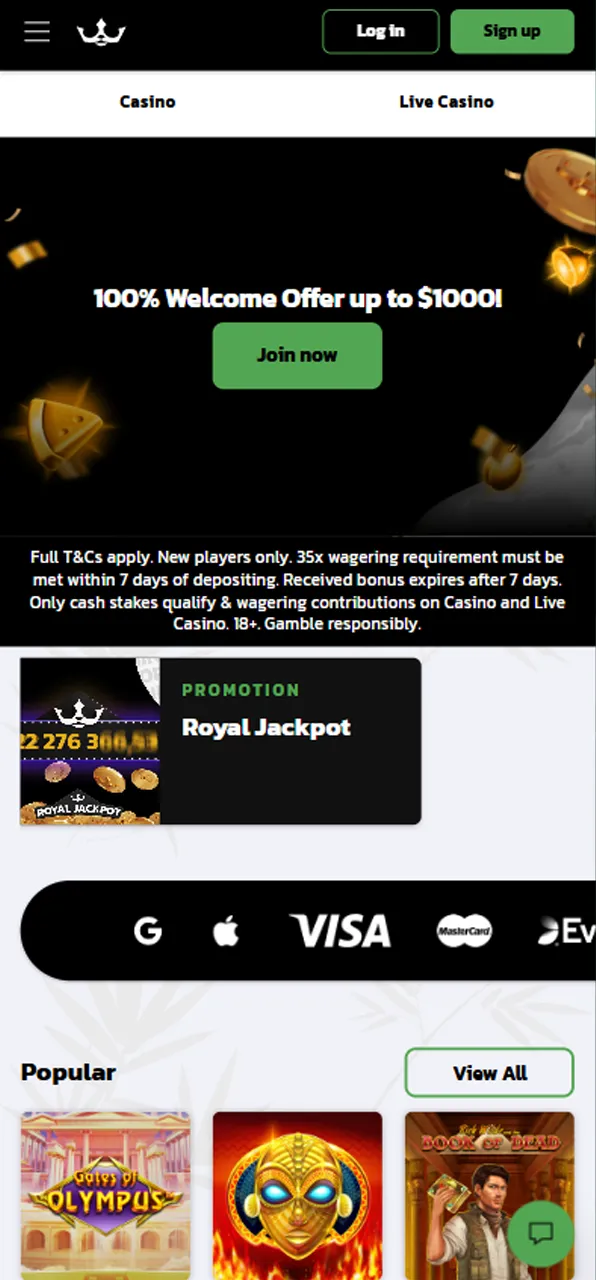 | Royal Jackpot | Opt-in inside eligible games; a fixed $0.10 jackpot bet funds Mini ($5), Minor ($100), Major ($10,000), Mega ($5,000,000). Random wheel awards one pot; 70% jackpot RTP sits apart from game RTP. Winnings credit instantly after verification. |