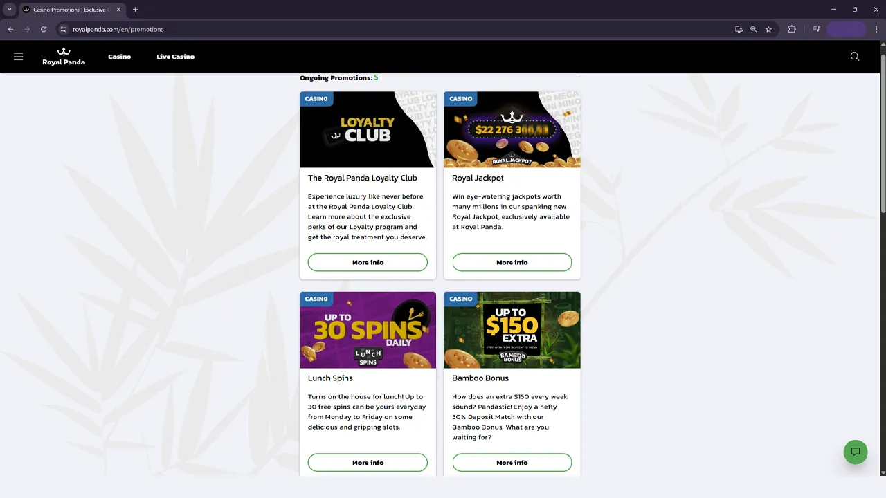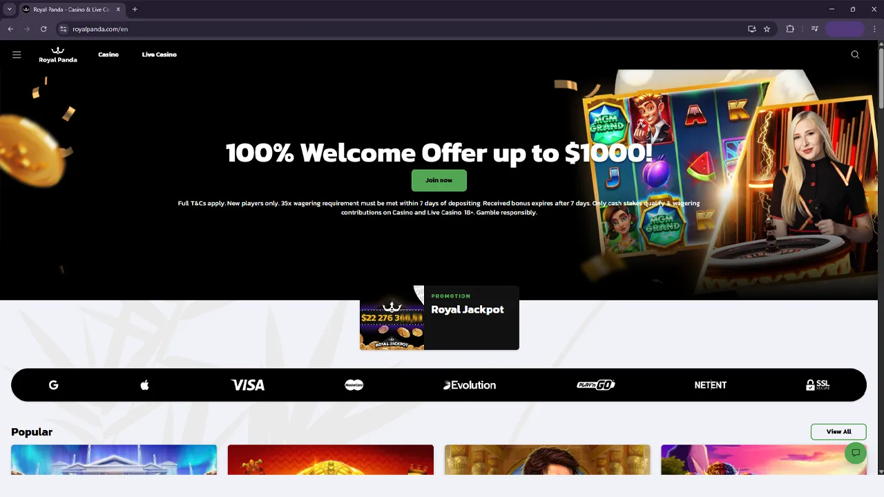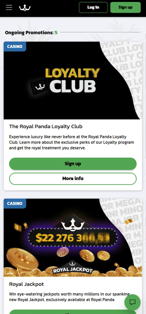 Available in your region!Royal Panda Casino, founded in 2014, is a stylish and reputable online casino known for its playful design and premium gaming experience. Operating under the LeoVegas Gaming Network, it offers a rich collection of slots, table games, and live dealer options, combining fun, reliability, and user-friendly gameplay for players around the world.
