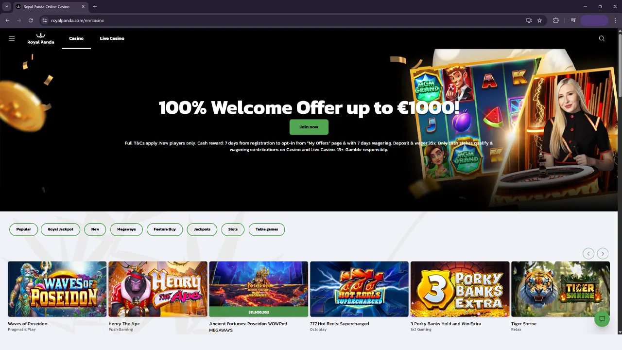 Is RoyalPanda legit? Yes. Royal Panda delivers a straight-talking casino experience with specific numbers on wagering, banking and jackpots. The 100% opener up to $1,000 is easy to activate in My Offers, completion is measurable and the conversion to cash after the target is clear. The weekly reload and lunchtime spin ladder add short, predictable windows for value, while the Royal Jackpot introduces a fixed $0.10 side bet that can escalate returns through four seeded pots.