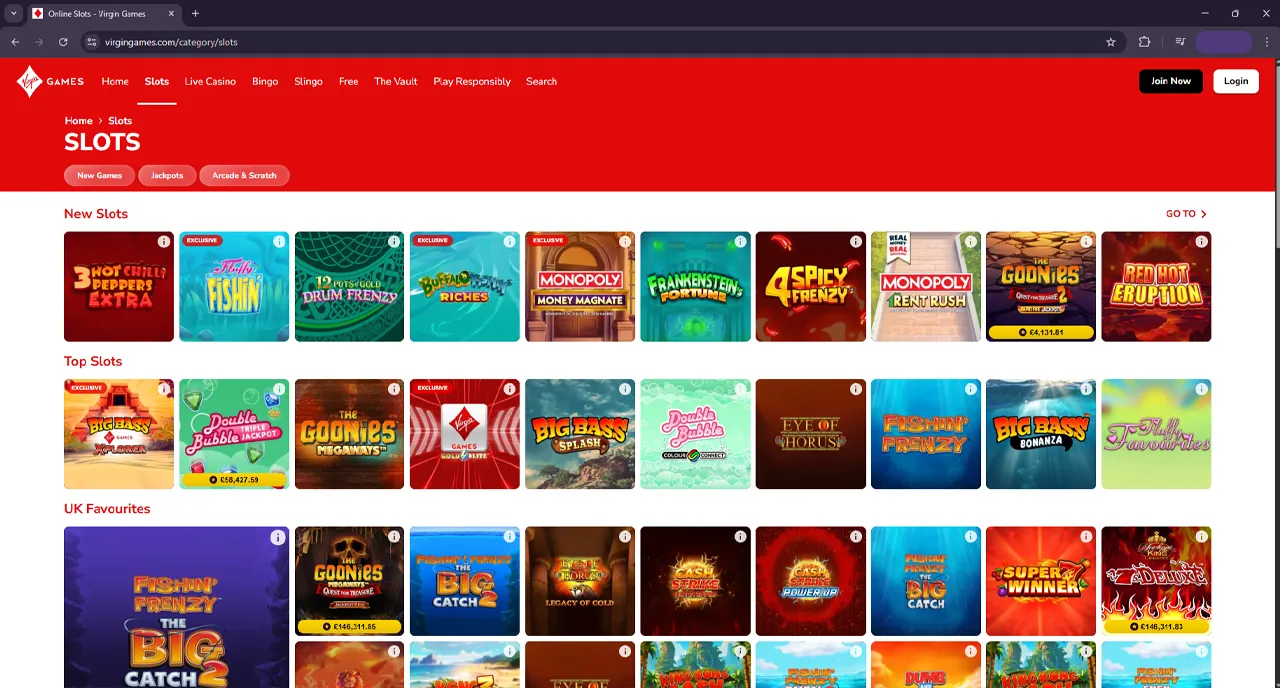 Virgin Games Casino offers a wide range of games, including online slots, table games, live-style casino titles, bingo, Slingo, and special promotional games. The selection suits both casual players and experienced casino fans.